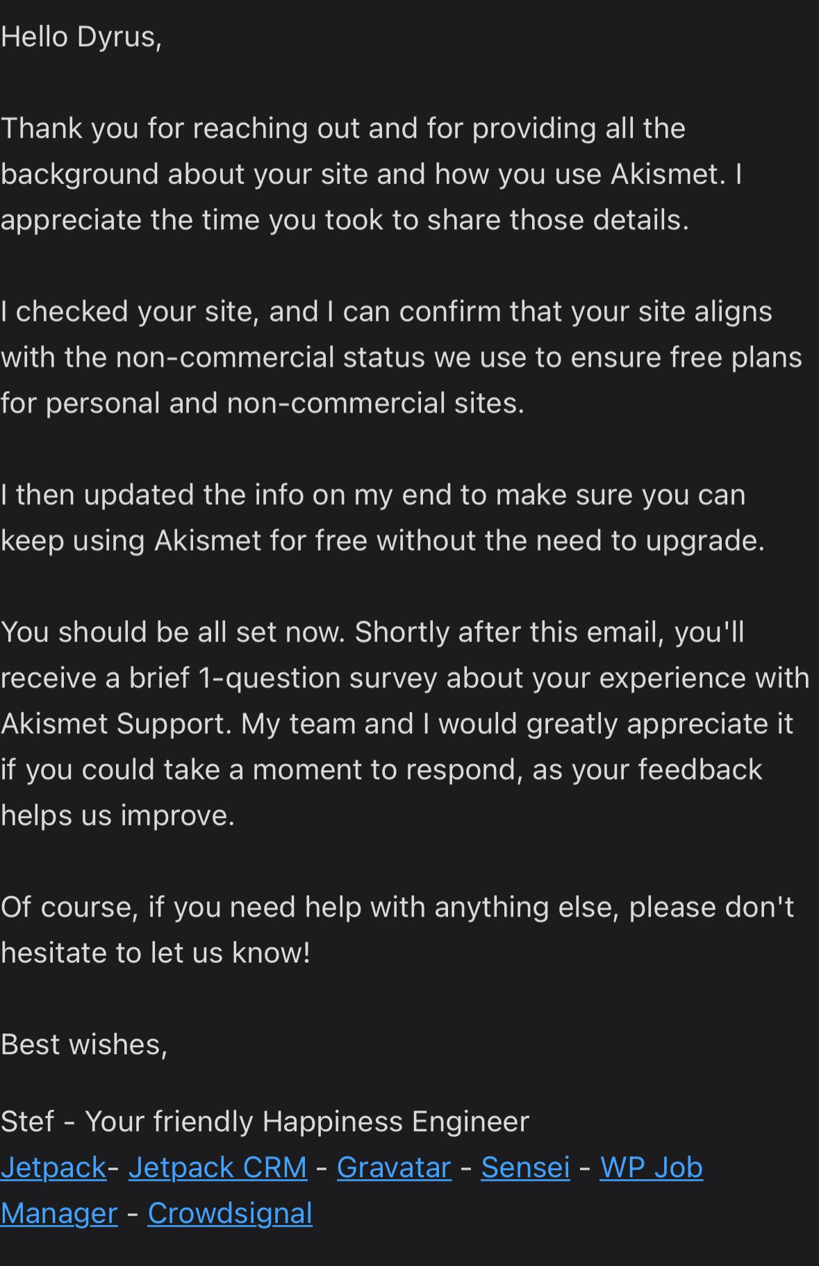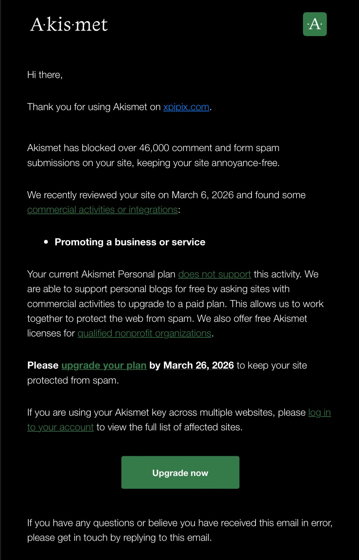 早幾天,收到由 Akismet 的電郵,因檢視過網站認為本站屬於商業性質,要求我升級計劃,否則不能使用該插件。